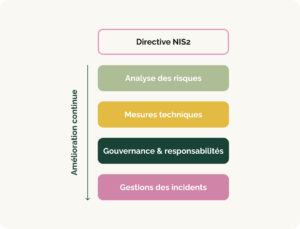 Elle impose notamment la réalisation d’analyses de risques formalisées, la mise en place de mesures techniques adaptées, une gouvernance claire de la cybersécurité et des procédures structurées de gestion des incidents. Elle introduit également une logique d’amélioration continue qui oblige les organisations à réévaluer régulièrement leur niveau de sécurité.